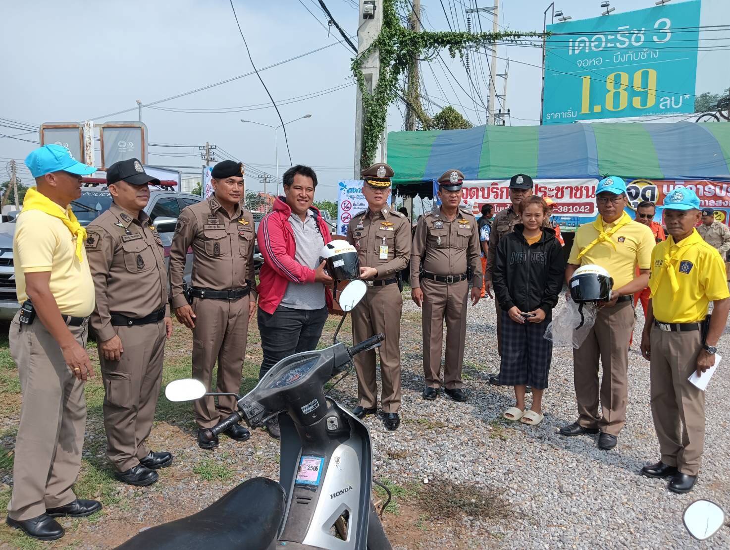 โดย ท่าน รอง ผบช.ภ.3(สุระ 3 )ได้ร่วมแจกสิ่งของหมวกนิรภัยแก่ผู้ขับขี่รถจักรยานยนต์เพื่อให้เกิดความปลอดภัย และกำชับให้ข้าราชการตำรวจ สภ.โนนไทย ดูแลรักษาความสงบเรียบร้อยและอำนวยความสะดวกการจราจรแก่ประชาชนในการเดินทางกลับภูมิลำเนา